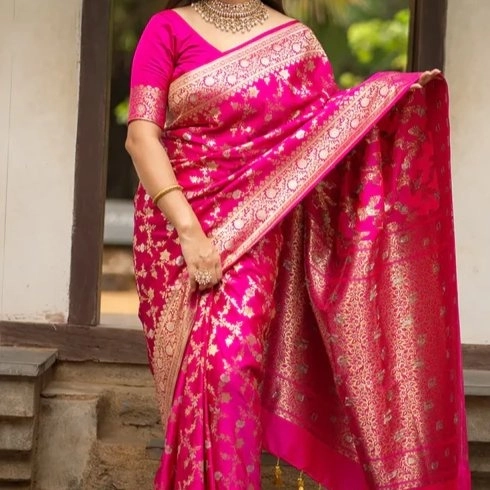 This elegant piece is perfect for special occasions. Pair it with traditional jewelry and a classic hairstyle to complete the look. For makeup, opt for a natural glow with a bold lip color to complement the outfit's sophistication. Consider adding statement earrings and a matching clutch to enhance the overall ensemble.