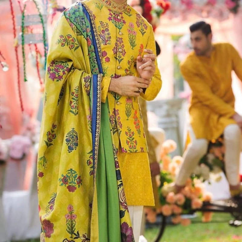 Sherwani/Long Kurta - A stunning yellow/mustard colored long coat with intricate floral embroidery and traditional motifs Embroidery Work - Features beautiful hand-embroidered or printed floral patterns in multiple colors including pink, green, and purple Dupatta - A contrasting green dupatta with decorative border, draped elegantly over the shoulder