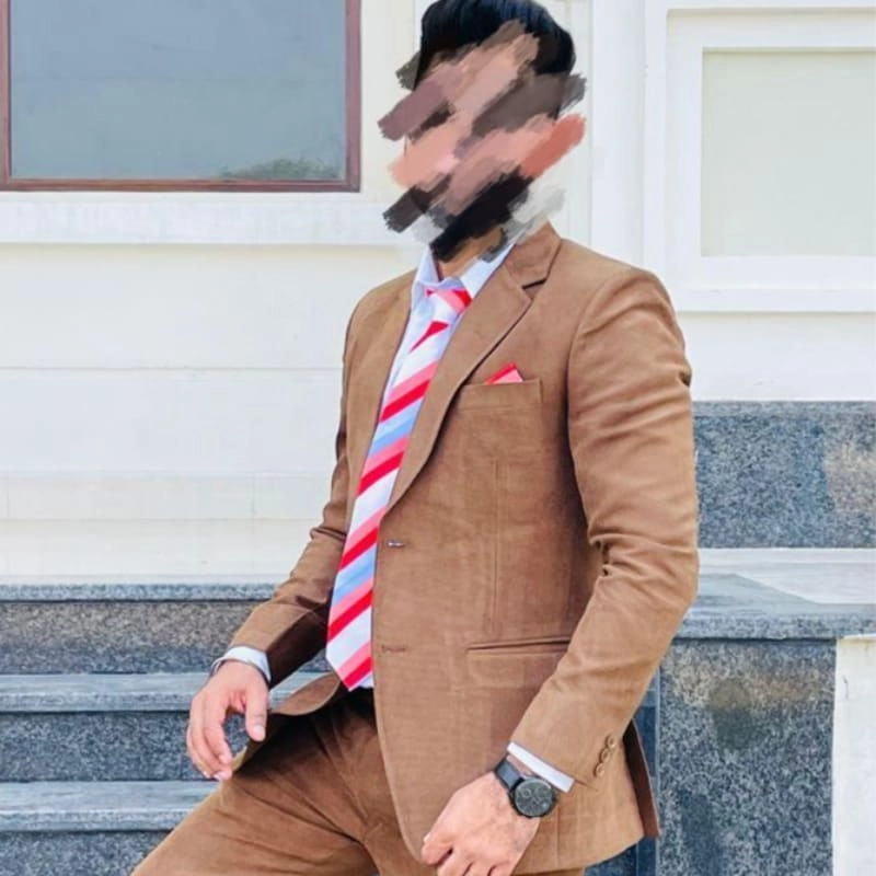 business suit consisting of a tailored blazer and matching trousers, paired with a white dress shirt and a red and white striped tie