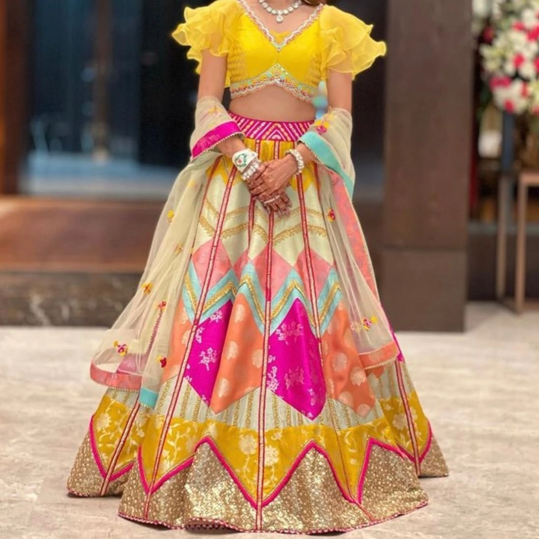 Bright yellow blouse paired with a multicolored lehenga featuring shades of pink, orange, turquoise, and gold with matching blouse with dupatta