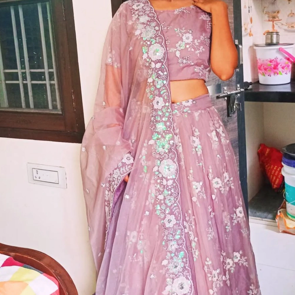 Pink embroidery lehenga that shimmers with every step. Fine threads of silver and rose weave delicate florals across the flowing fabric, each stitch telling a quiet story of heritage and grace. Her bangles chime gently as hennaed hands gather the skirt in a playful swirl.