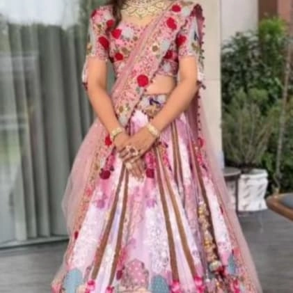 This stunning floral lehenga ensemble presents a masterpiece of contemporary Indian fashion with its vibrant multi-colored design set against a soft pink base. The voluminous lehenga skirt showcases an enchanting botanical print featuring an array of colorful flowers in shades of red, pink, purple, and other jewel tones, creating a garden-like tapestry across the fabric. The skirt's silhouette is beautifully structured with multiple layers that create elegant volume and movement, while the hem features intricate border work with gold accents that add a luxurious finish. The fitted choli blouse mirrors the skirt's floral motifs with short sleeves and a flattering neckline, maintaining design consistency throughout the ensemble. The dupatta complements the outfit perfectly, draped gracefully with matching floral patterns and delicate border detailing that ties the entire look together. The fabric appears to have a subtle sheen that enhances the vibrancy of the floral prints, while gold threadwork and embellishments are strategically placed to add traditional elegance to this modern interpretation of classic Indian wear. This ensemble represents a perfect blend of contemporary floral aesthetics with traditional lehenga craftsmanship, making it ideal for festive occasions, celebrations, or special events where a statement-making outfit is desired.