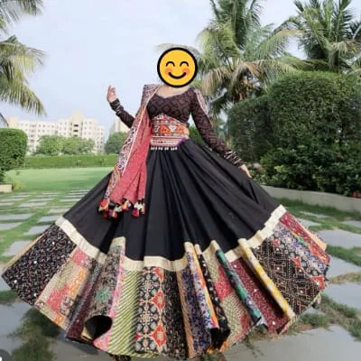 A fitted choli (blouse) with traditional geometric mirror work and embroidery in burgundy/maroon A dramatic black ghagra/lehenga (long skirt) with an extremely wide flare The skirt's border is decorated with patchwork panels featuring various traditional Gujarati textile patterns, including Ajrakh prints, Bandhani, geometric designs, and tribal motifs A dupatta (scarf) with matching patchwork and traditional patterns, adorned with colorful tassels