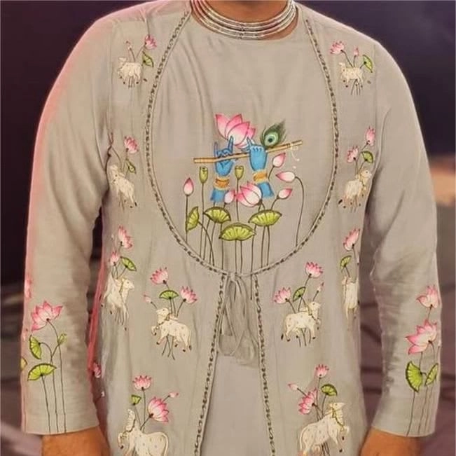 A graceful pastel-grey achkan layered over a matching kurta–churidar, adorned with intricate hand-painted motifs inspired by Lord Krishna. The artwork features lotus flowers, peacock feathers, and sacred cows, symbolizing devotion, purity, and harmony. Delicate detailing along the panels adds a refined, regal finish, making this ensemble ideal for festive celebrations, weddings, cultural events, and stage appearances.