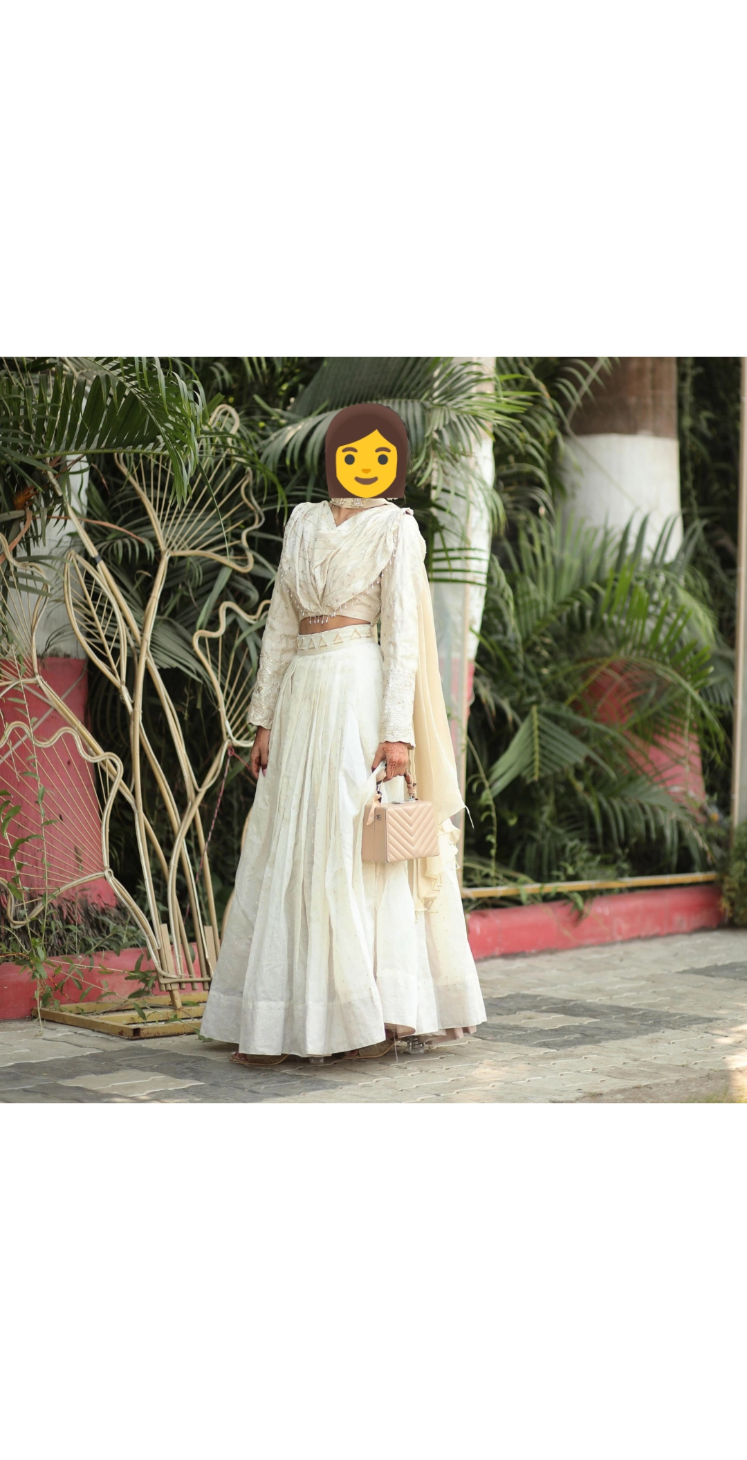 A stunning ivory lehenga set exudes elegance with its flowing pleated skirt, full-sleeved embroidered blouse, and draped dupatta. Accented with statement earrings and a chic beige handbag, this ethereal look is perfect for weddings or festive celebrations.