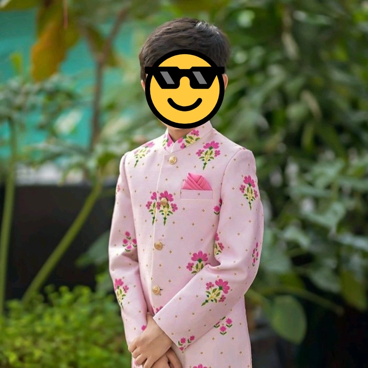 This ensemble represents modern children's ethnic wear that blends traditional Indian silhouettes with contemporary prints and colors. The soft pink base with floral motifs creates a gentle, refined appearance while the fitted churidar and structured kurta maintain the classic Indian formal aesthetic. The golden button details and mandarin collar add subtle luxury elements that make this outfit suitable for important celebrations like weddings, religious ceremonies, or cultural festivals.