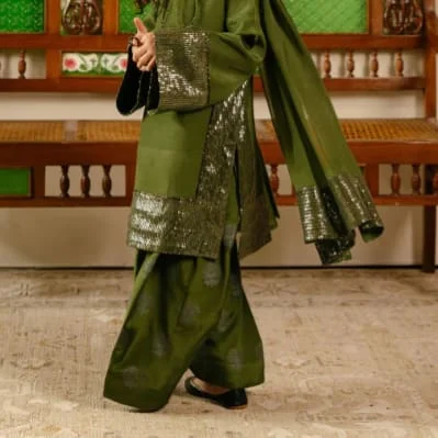 The outfit features a rich olive green kurta with wide bell sleeves, beautifully highlighted with sequin embellishments on the cuffs and hem. It is paired with a matching sharara bottom in a subtle floral jacquard pattern and a coordinating dupatta. The look is completed with traditional jewelry, giving it a festive and royal appeal. Perfect for weddings, festive functions, and cultural celebrations.