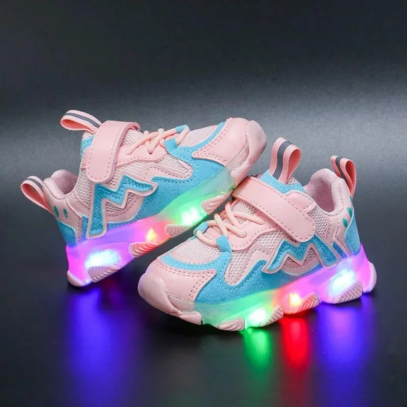 Fun and vibrant kids LED light shoes with colorful flashing soles, combining comfort, style, and excitement