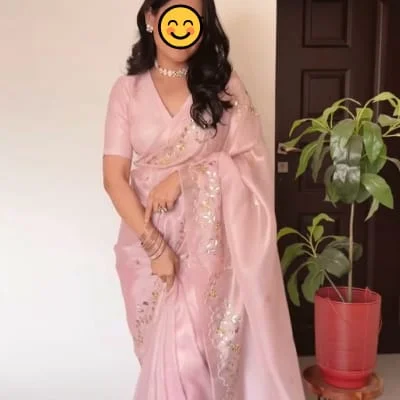 This is a lovely soft pink or blush-colored saree with delicate floral embroidery work scattered throughout the fabric. The saree features intricate golden threadwork and sequin details that create beautiful floral motifs across the drape. The fabric appears to be a fine material, possibly organza or chiffon, which gives it a light, ethereal quality. The embroidery work includes small flowers and botanical patterns that are elegantly distributed across the saree, creating a subtle yet refined decorative effect. The overall design has a romantic, feminine appeal with its soft color palette and delicate embellishments.