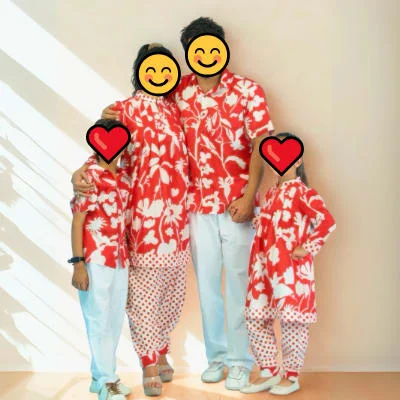 The family is dressed in what appears to be family matching pajama sets or coordinated sleepwear collection. The women and children are wearing long-sleeved tops with matching pants that have contrasting white fabric with red polka dots on the lower portions of the legs. The man is wearing a short-sleeved button-up shirt in the same tropical print, paired with light blue or mint green pants.