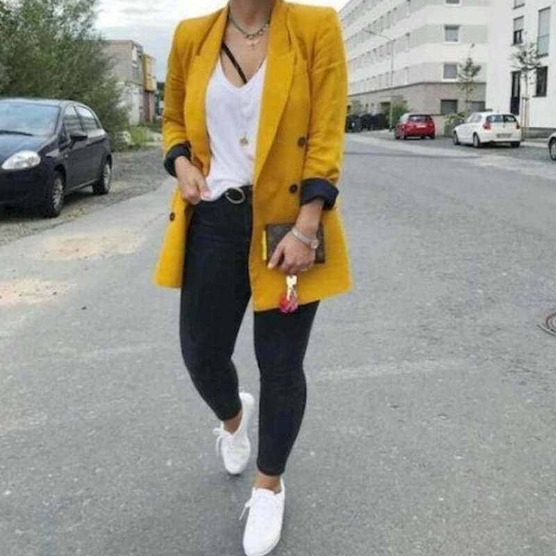 A tailored, structured fit with a slightly longer length.Double-breasted style with button detailing.Rolled-up sleeves with contrasting inner lining.Lightweight fabric suitable for casual to semi-formal wear.