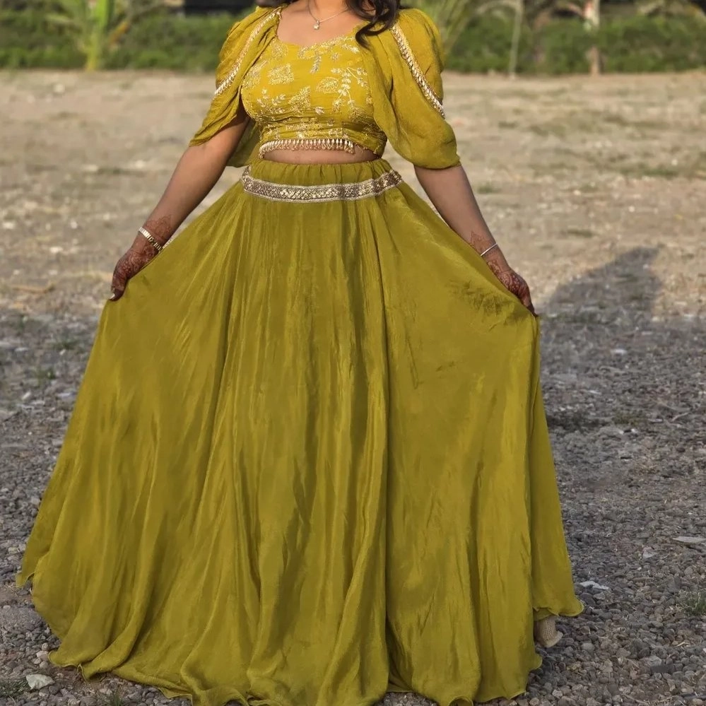 Olive green plan chaniya with beautifully embroidered crop blouse
