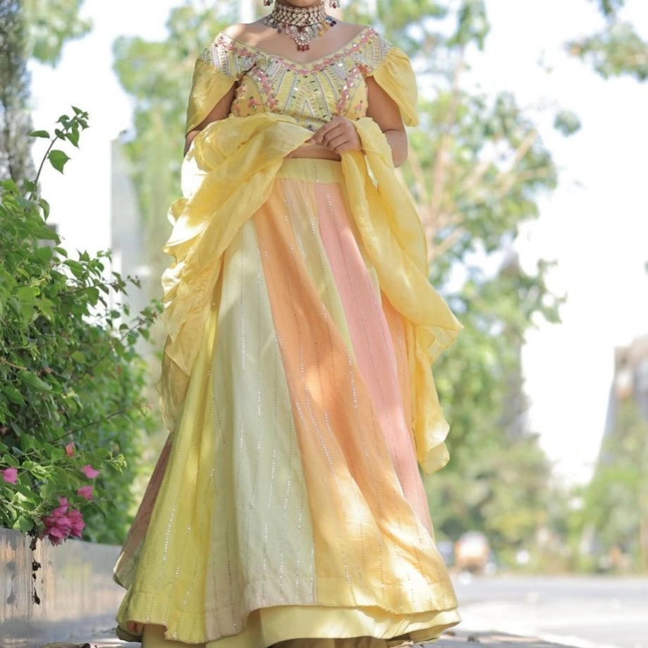 multi-tone pastel lehenga,off-shoulder blouse,organza dupatta