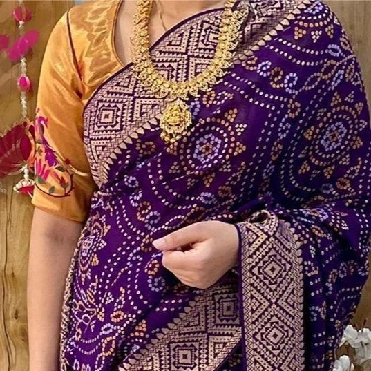 Deep royal purple with white and mustard-yellow Bandhej patterns