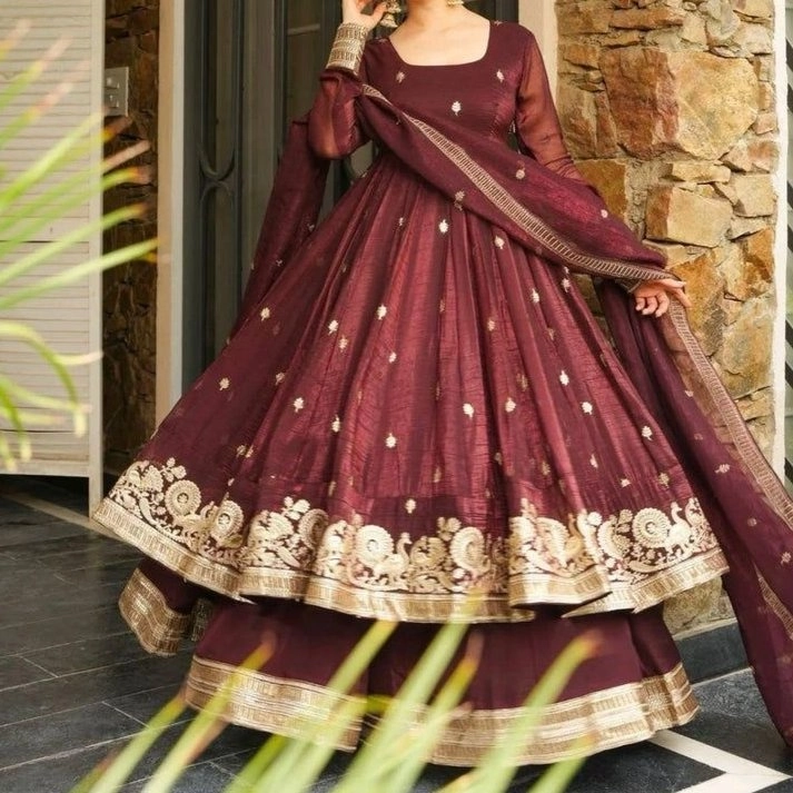 Long Anarkali-style kurta with a fitted bodice and dramatically flared skirt Square neckline with full sleeves,Layered lehenga skirt underneath that peeks through Matching dupatta draped diagonally across.Three-piece coordinated ensemble