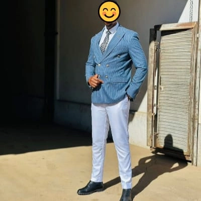 I can see this is a stylish portrait of a man wearing a light blue pinstriped double-breasted blazer with a patterned tie and light blue dress shirt underneath. He's paired it with white or light gray trousers and black dress shoes. He's wearing glasses and has a confident pose with one hand positioned at his waist. The setting appears to be outdoors with concrete flooring and what looks like wooden shutters or doors in the background, creating an urban or industrial aesthetic.
