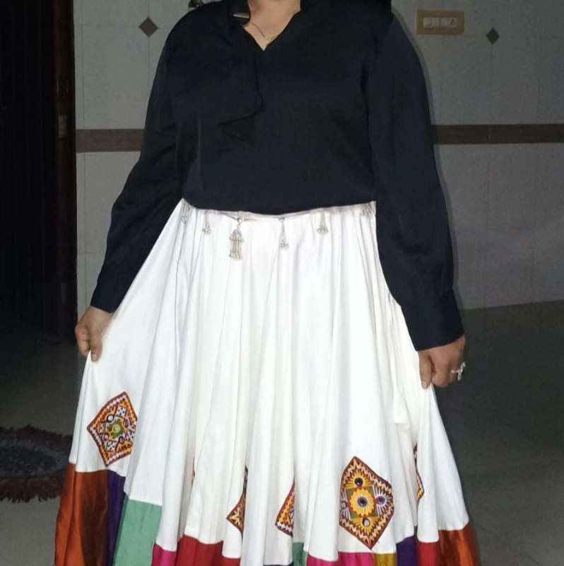 black long-sleeved blouse or choli.The skirt features a white base with colorful panels in green, pink, yellow, purple, and other bright hues, along with intricate golden borders and decorative patterns.