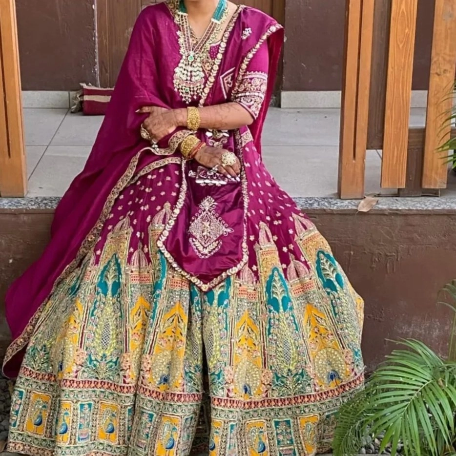 worked chaniya with merzenta colour blouse with 2 dupatta