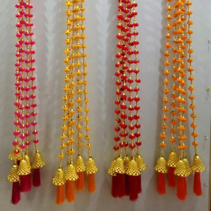 They are made with brightly colored artificial flowers in pink, yellow, red, and orange.The garlands are often decorated with golden beads in between for an elegant look.