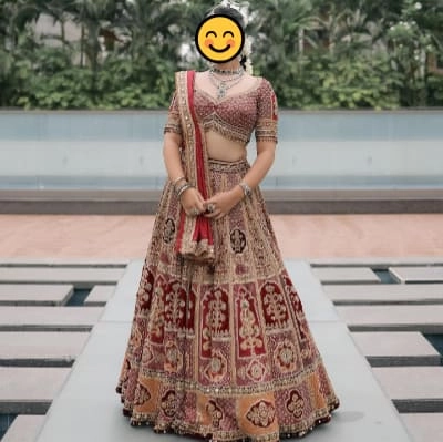 This is a photo of a woman wearing a traditional bridal lehenga in rich maroon and gold tones. The lehenga is heavily adorned with intricate zari, sequins, and thread embroidery in floral and geometric patterns, creating a royal and regal look. The blouse is equally embellished, featuring detailed work with short sleeves and a deep neckline, while the red dupatta with golden borders adds the perfect finishing touch.
