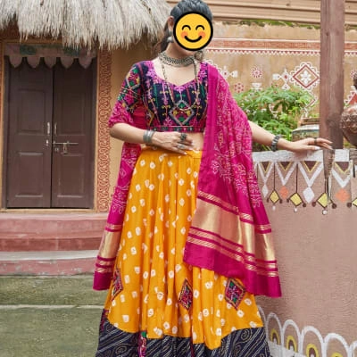 Blouse (Choli): Navy blue with colorful kutchi/mirror embroidery, half sleeves, and a deep neckline. Lehenga (Skirt): Bright yellow with white bandhani print, detailed with embroidered patchwork, and a contrasting black patterned border. Dupatta: Magenta-pink with golden zari border and bandhani-style embroidery.