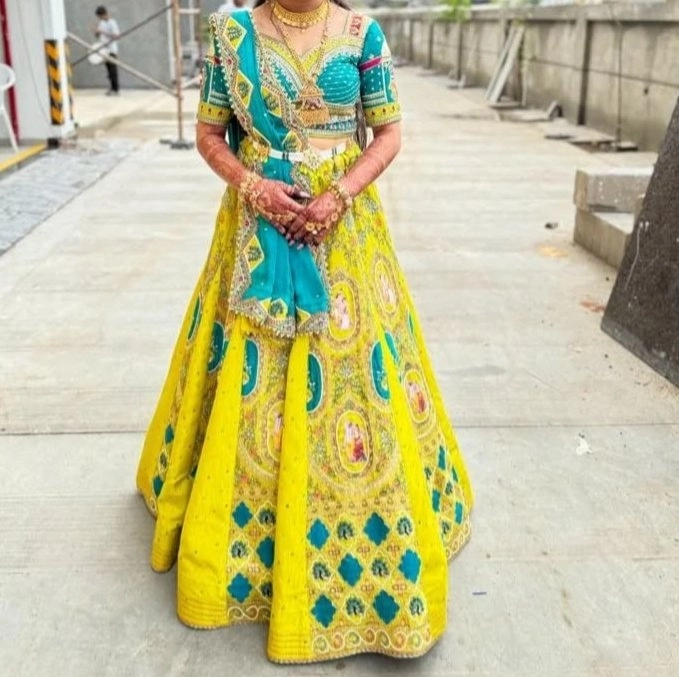 Bright Yellow and Peacock Blue with Multicolor Embroidery designer chaniya with blouse