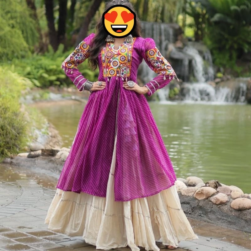 Bright magenta long jacket-style Anarkali kurta with embroidered mirror work on the yoke and sleeves. Flared cream skirt (ghagra/lehenga) underneath. This type of attire is commonly worn during Navratri, weddings, or festive occasions.