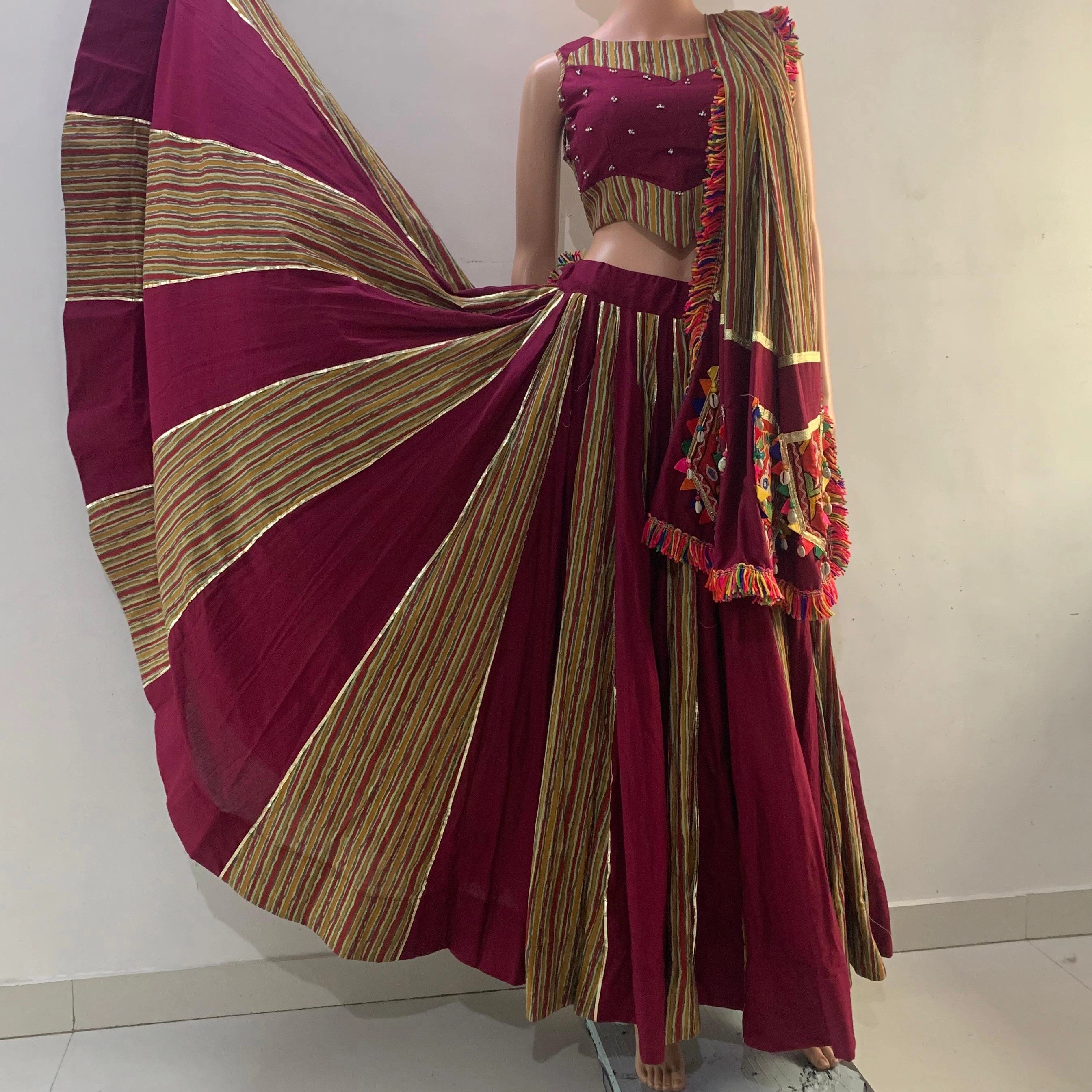 Lehenga Choli with Dupatta,Sleeveless maroon blouse with small embroidered embellishments.,Long flared maroon skirt with striped design panels.Striped fabric with colorful fringes and mirror/patchwork embroidery at the edges.
