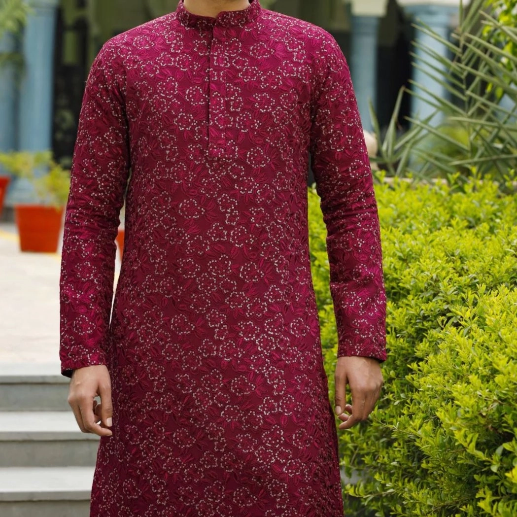 maroon/burgundy long Kurta with all-over embroidery and Pajama or churidar
