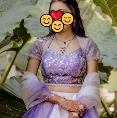 young woman dressed in a traditional Indian lehenga choli. She is wearing a beautifully embroidered purple blouse with sequins and beadwork, paired with a matching flowy lehenga skirt and a light net dupatta draped around her arms. Her outfit sparkles with intricate detailing and has a festive, elegant look.