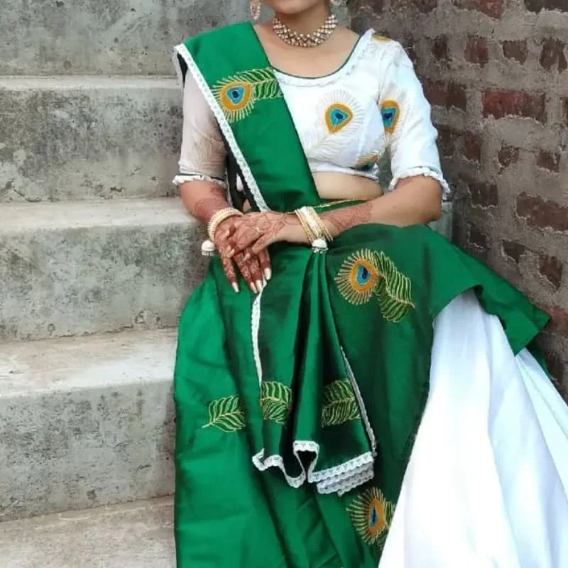 The peacock feather design is particularly striking and is often associated with Lord Krishna in Indian culture. The outfit appears to be for a cultural or religious celebration, possibly related to Krishna Janmashtami or another festival.