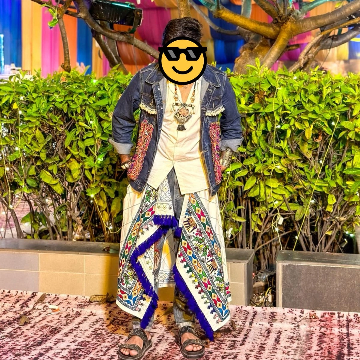 This is a modern fusion look that combines Western denim with traditional Indian elements. The embroidered dupatta appears to have Kutchi/Gujarati or Rajasthani style mirror work and geometric patterns. This type of styling is popular for cultural events, festivals, or casual traditional occasions where people want to blend contemporary and ethnic fashion.