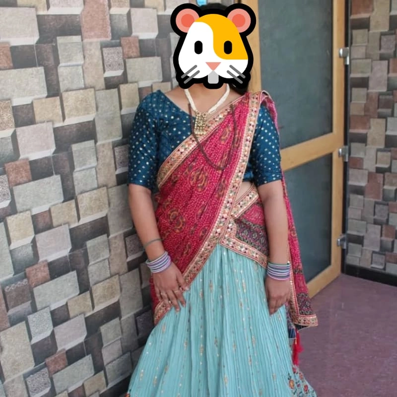 A stunning teal/turquoise lehenga skirt with intricate floral embroidery and patterns along the hem A navy blue blouse with small golden dots or motifs all over A gorgeous pink/magenta dupatta with decorative borders that adds a beautiful pop of color The way the dupatta is draped creates an elegant silhouette