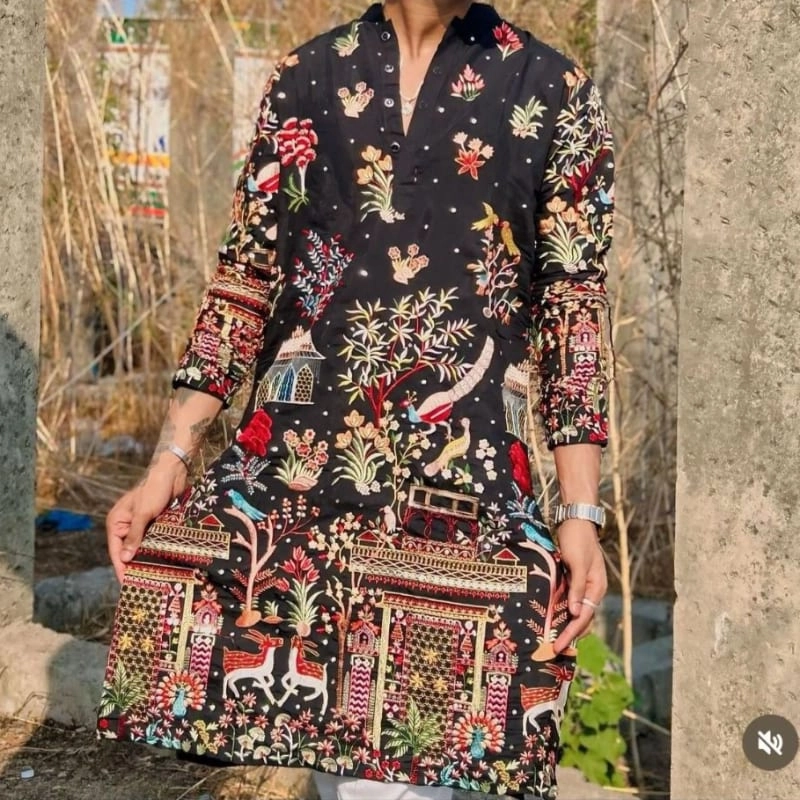 This elegant piece is perfect for special occasions. Pair it with traditional jewelry and a classic hairstyle to complete the look. For makeup, opt for a natural glow with a bold lip color to complement the outfit's sophistication. Consider adding statement earrings and a matching clutch to enhance the overall ensemble.