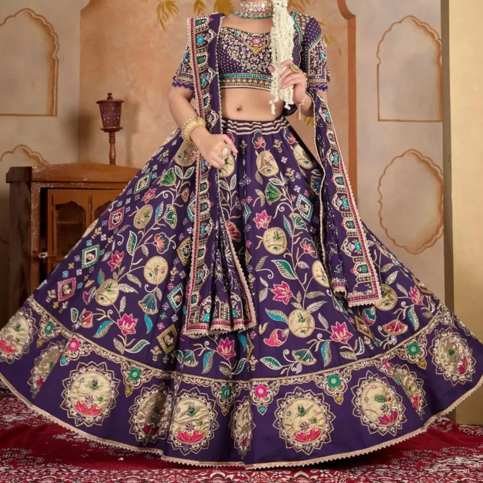 Rich royal purple/navy base fabric with Traditional gota patti work ,Traditional cropped style blouse with Matching purple fabric dupatta