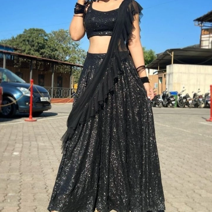 traditional three-piece outfit in black with sequin work Lehenga choli Choli or blouse black sequined crop top with short sleeves