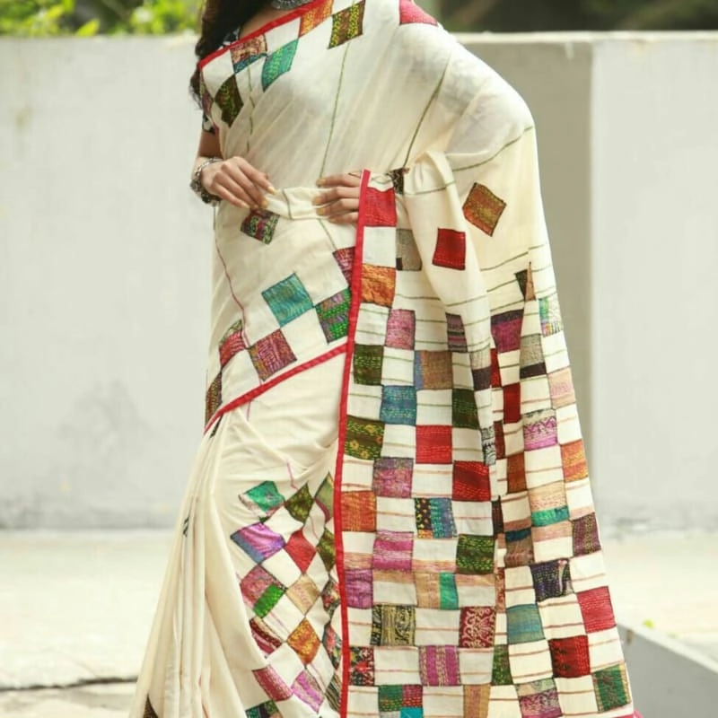 A cream or off-white base fabric that serves as the canvas Stunning patchwork consisting of colorful fabric squares in various textures and patterns