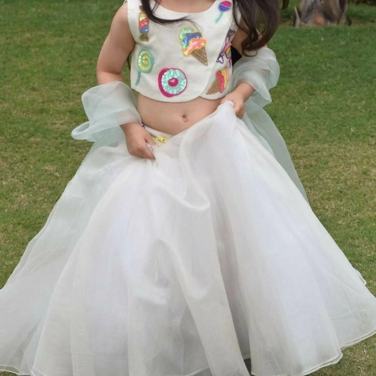 the crop top with colorful ice cream, donut, and lollipop prints and white plan chaniya