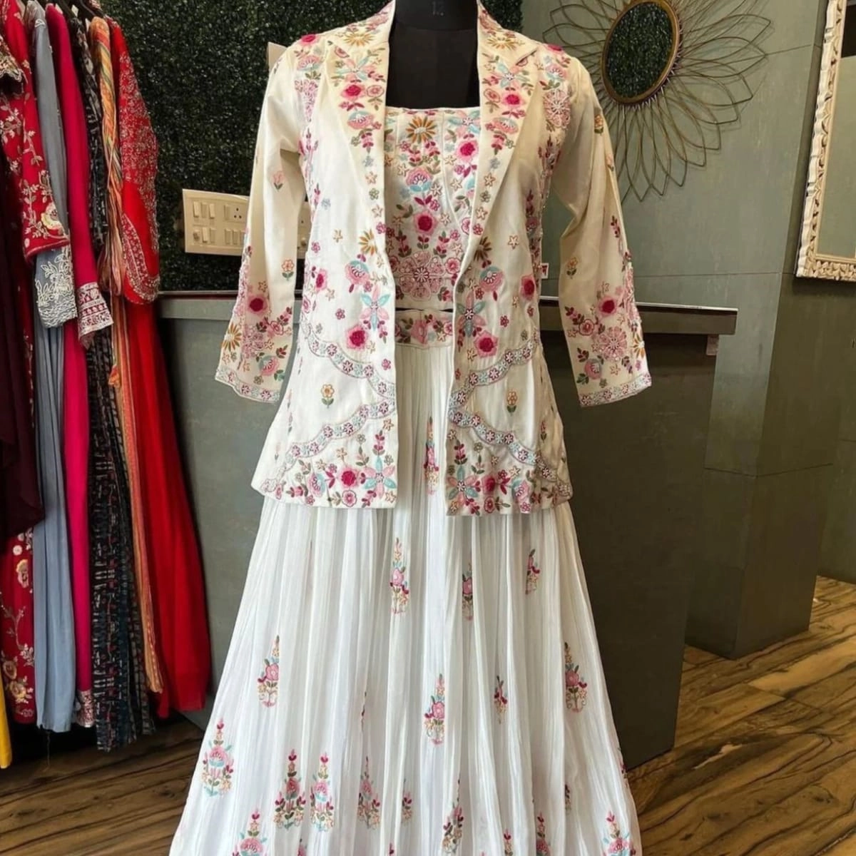 This elegant piece is perfect for special occasions. Pair it with traditional jewelry and a classic hairstyle to complete the look. For makeup, opt for a natural glow with a bold lip color to complement the outfit's sophistication. Consider adding statement earrings and a matching clutch to enhance the overall ensemble.